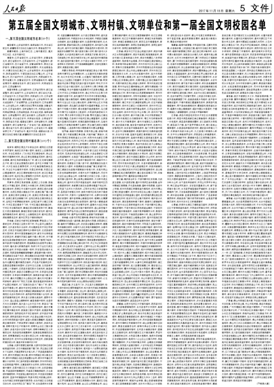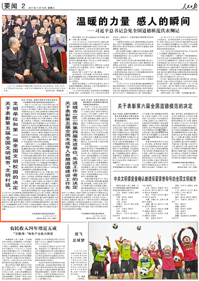 11月17日,全國精神文明建設表彰大會在京舉行。中共中央總書記、國家主席、中央軍委主席習近平在人民大會堂親切會見參加大會的新一屆全國文明城市、文明村鎮、文明單位、文明校園、未成年人思想道德建設工作先進代表和全國道德模范代表,向全體代表表示熱烈的祝賀,勉勵他們再接再厲,在社會主義精神文明建設中再立新功、作出表率。