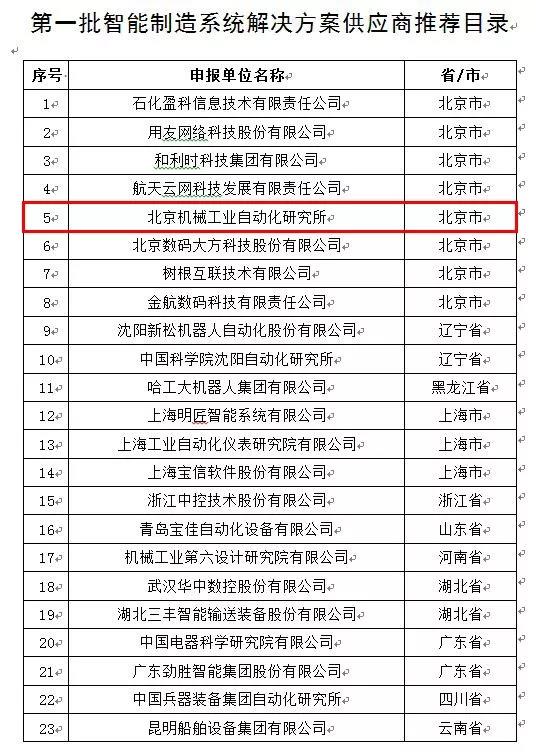 12月4日,為深入貫徹落實《中國制造2025》(國發(fā)〔2015〕28號)和《智能制造發(fā)展規(guī)劃(2016-2020年)》(工信部聯(lián)規(guī)〔2016〕349號),加快培育智能制造系統(tǒng)解決方案供應(yīng)商,經(jīng)企業(yè)申報、專家評審、網(wǎng)上公示,工業(yè)和信息化部確定了第一批智能制造系統(tǒng)解決方案供應(yīng)商推薦目錄,北京機械工業(yè)自動化研究所(以下簡稱北自所)位列其中。